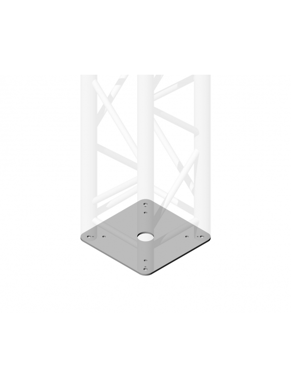 Ideal for floor mounting of TRQ30S2 series square trusses. Compatible with 29 cm side trusses. Floor mounting holes inside the truss. Central hole for cable passage. Dimensions 29x29 cm, weight 3.8 kg.